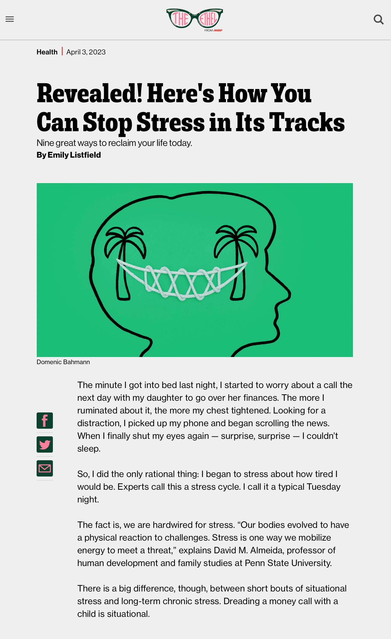 Editorial illustration for The Ethel / AARP Magazine – Revealed! Here's How You Can Stop Stress in Its Tracks.
