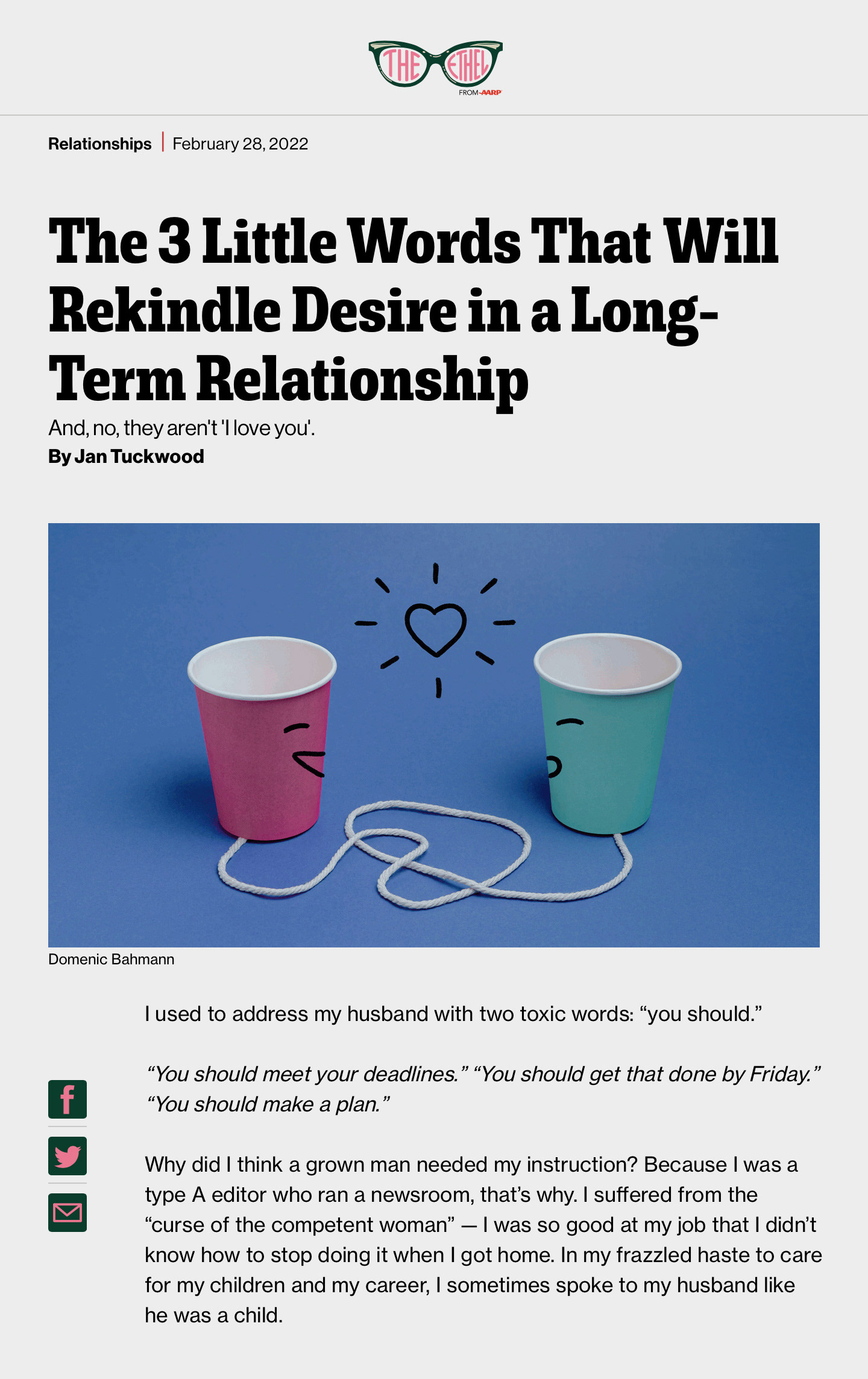 Editorial illustration for The Ethel / AARP Magazine – The 3 Little Words That Will Rekindle Desire in a Long Term Relationship – And, no, they aren't 'I love you'.