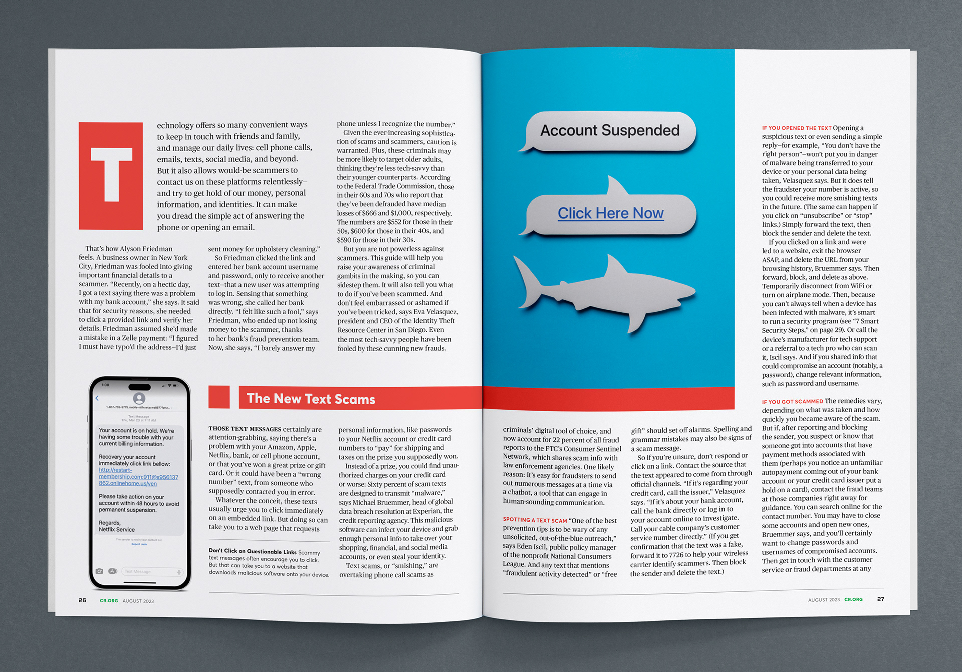 Editorial illustrations for The Consumer Reports Scam Protection Guide – It's harder than ever to tell if that email, text, or phone call is from someone trying to steal your money, personal information, or both.