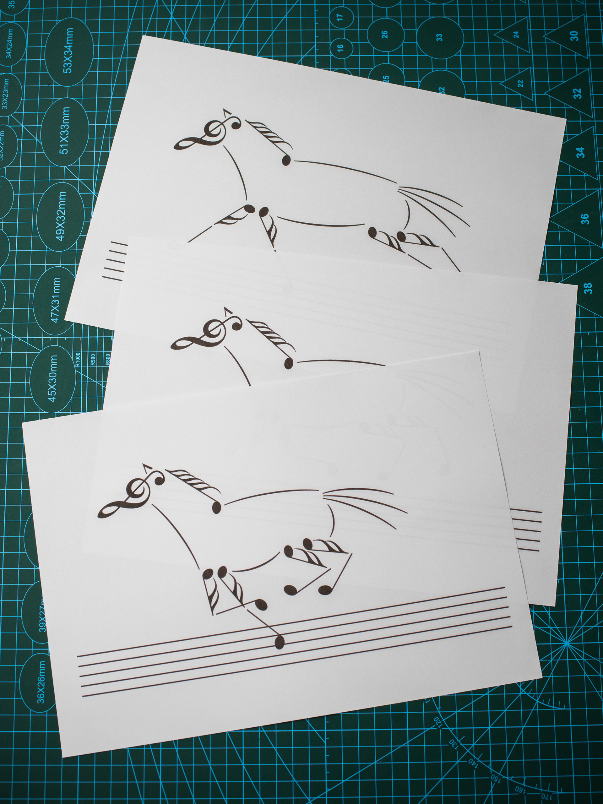 Notes are removed from their original purpose of displaying sheet music to create the shape of a running horse. The different frames were printed on ten sheets of paper and scanned to create a stop-motion loop video.